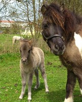 Falbina genannt Falbi kam im Oktober 2011 zu uns. Wir haben sie in einem ganz schlechten Zustand geschenkt bekommen. In ihrer alten Herde wurde sie komplett ausgeschlossen. Sie war psychisch total am Boden und durch ein Ekzem auch gesundheitlich stark geplagt. Bei uns darf sie sich jetzt erst einmal erholen. Sie hat 2013 ein gesundes Hengstfohlen Findus zur Welt gebracht und das hat ihr sichtlich gut getan. Ein liebes Shetlandpony, das gerne vor dem Sulky läuft.